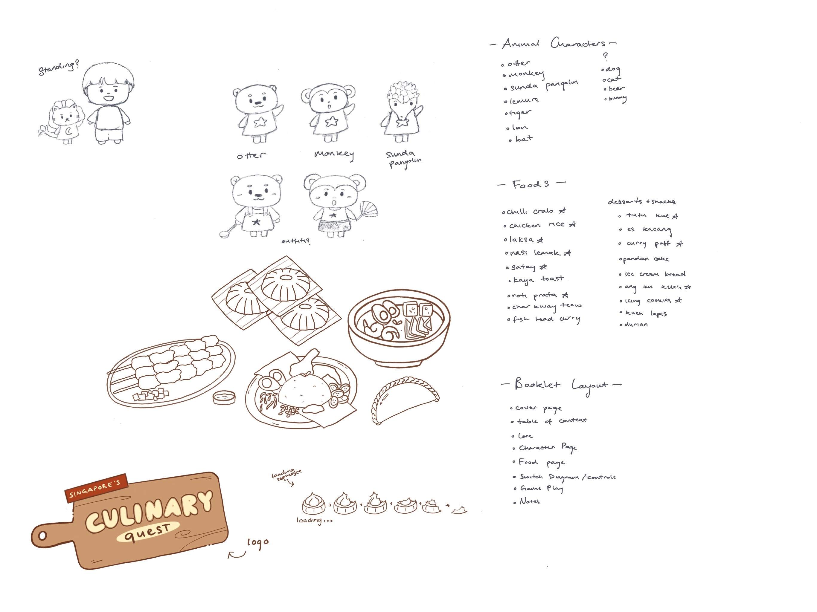 At the start of the project, I knew I wanted to create a game, but I hadn’t yet decided on the exact direction or genre. What I did know was that I wanted to incorporate themes that mattered to me like cute, charming characters and elements inspired by Singaporean food culture. To explore different possibilities, I sketched out three distinct game concepts, each with its own unique approach to these ideas.